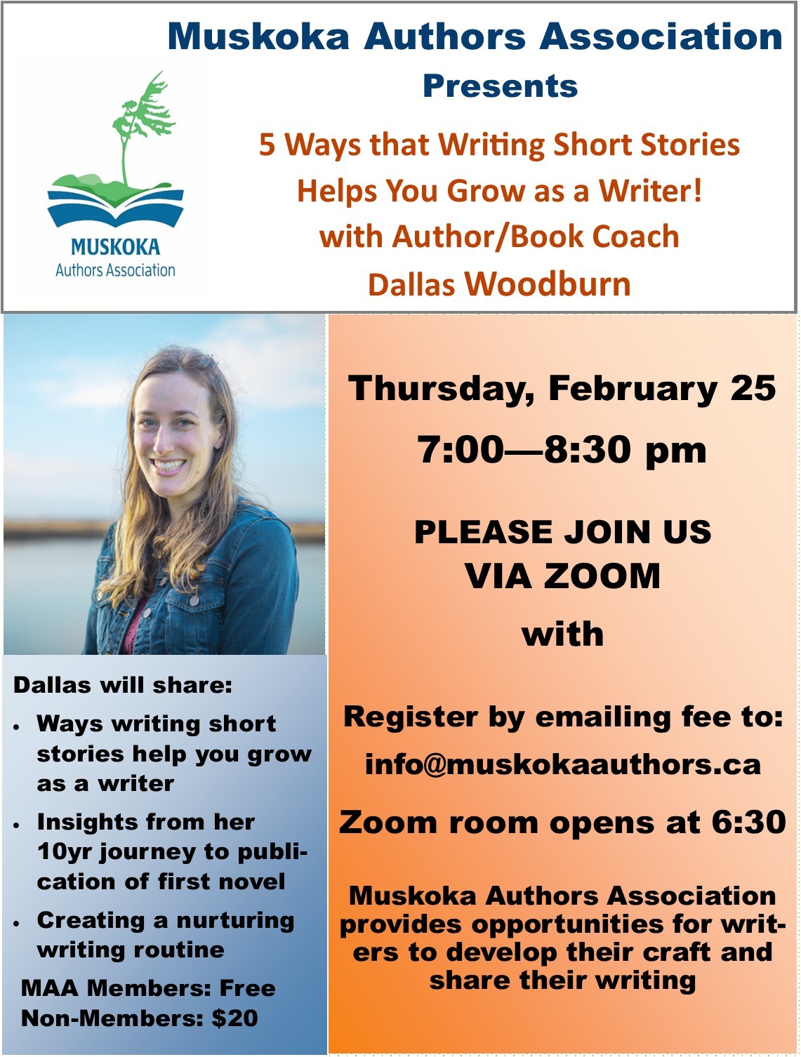 To register, please email your contact information and e-transfer payment to info@muskokaauthors.ca.