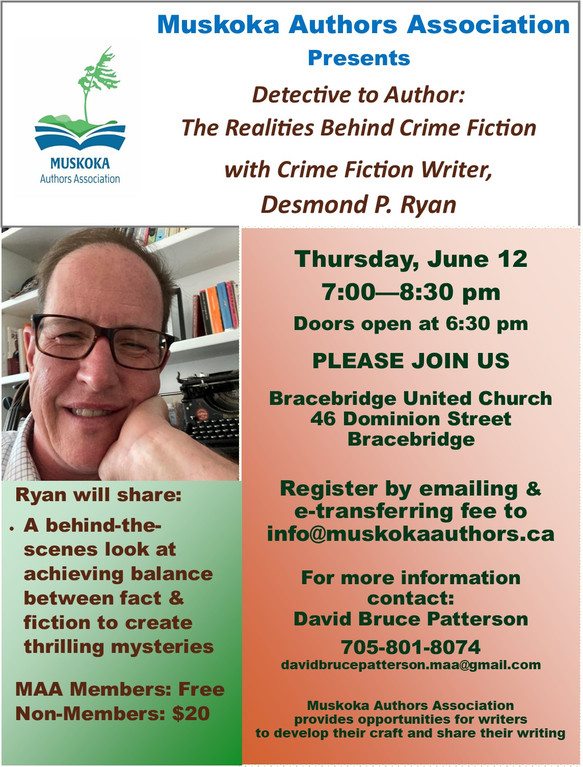 Join Muskoka Authors Association on Thursday, June 12, for an exciting presentation by crime fiction writer, Desmond P. Ryan. Ryan will share stories and insights from almost thirty years of experience as a Toronto Police detective, exploring how real-life investigations and police work have influenced his crime fiction writing. Drawing from firsthand experience, Desmond will discuss how the details of criminal investigations—from procedure to human behavior—shape stories that connect with readers.