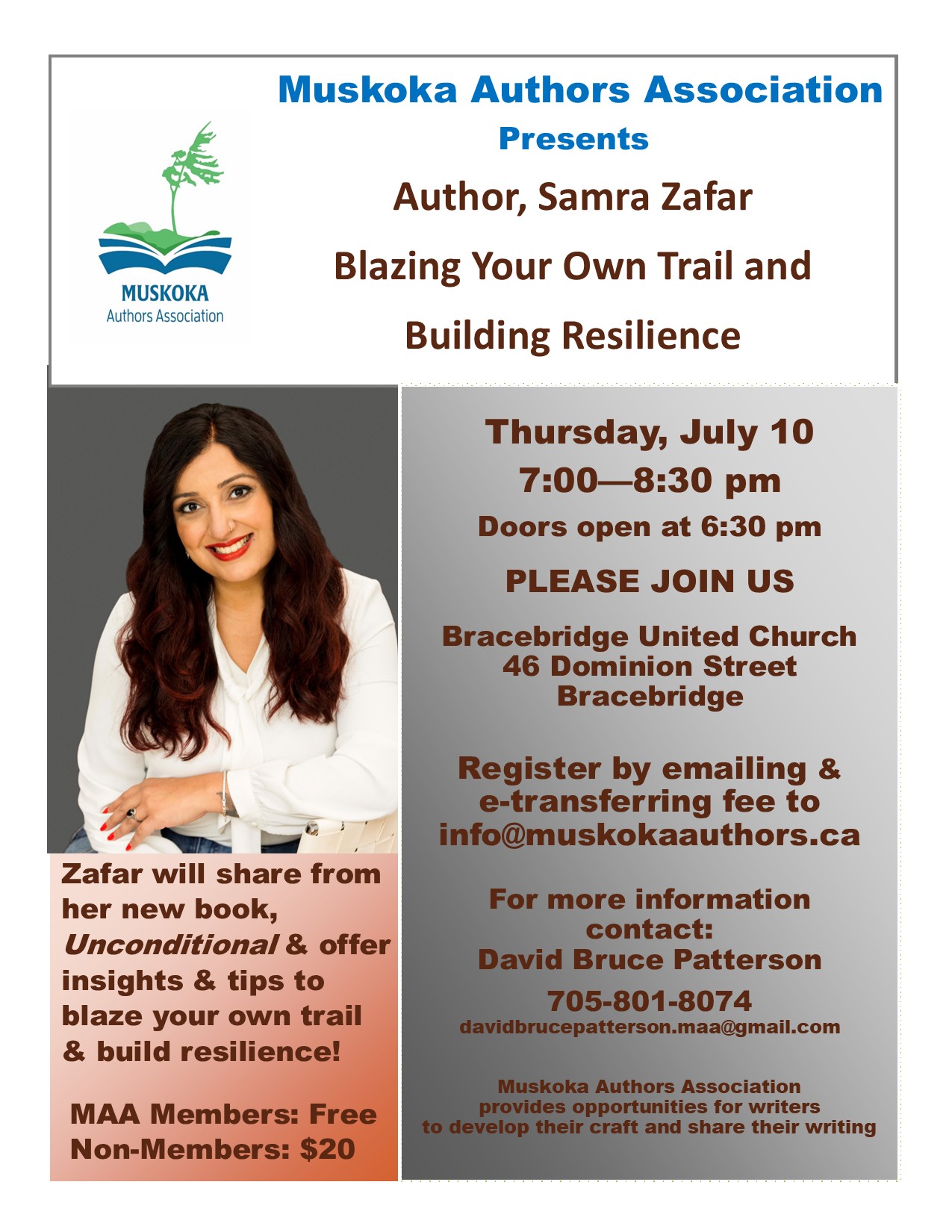 On Thursday, July 10, you are invited to be inspired by award-winning, internationally renowned speaker, physician, author and educator, Samra Zafar. Zafar will share her personal journey to publication and offer advice based on her new book, Unconditional, about blazing your own trail and building resilience in your life.