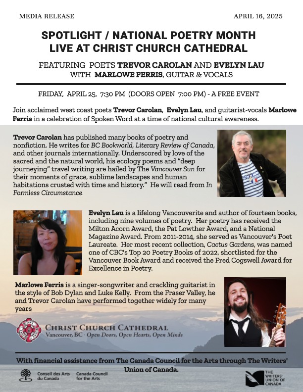 You’re invited to join poets Trevor Carolan and Evelyn Lau, and guitarist-vocals Marlowe Ferris, live and free, on Friday, April 25, reading at Christ Church Cathedral. A free event at a time of national cultural awareness.