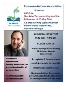 FADE IN: The Art of Screenwriting (and the Bitterness of Writing One) $20 for MAA Members; $50 for Non-Members To register, please email your contact information and e-transfer payment to info@muskokaauthors.ca. What does it really take to turn a story into a screenplay—and survive the process with your creative soul intact? Muskoka Authors Association is thrilled to welcome filmmaker and screenwriter Geordie Sabbagh for an engaging, candid, and darkly funny workshop on the art, craft, and emotional reality of screenwriting. FADE IN: The Art…
